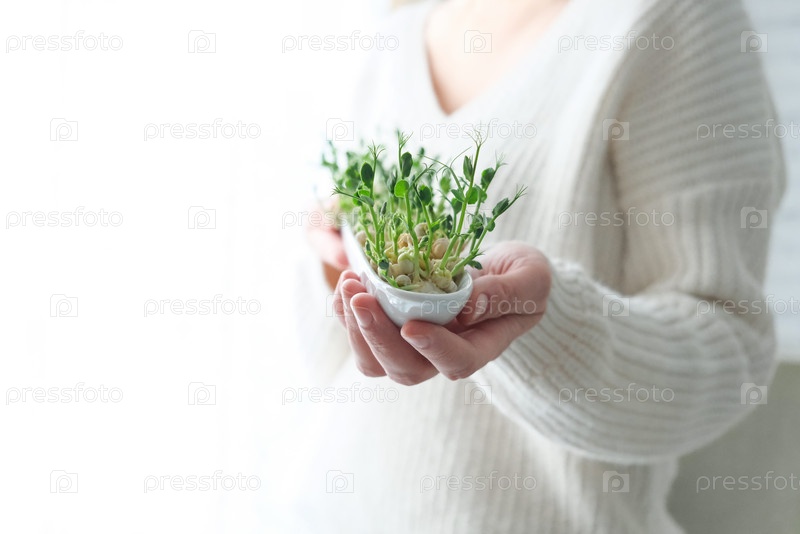 Микрозелень гороха в руках женщины. День Земли. Выращивание семян в домашних условиях. Место для текста. Концепция веганства и здорового питания. Выращивание побегов