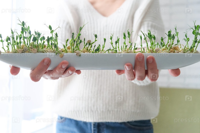 Микрозелень гороха в руках женщины. День Земли. Выращивание семян в домашних условиях. Место для текста. Концепция веганства и здорового питания. Выращивание саженцев