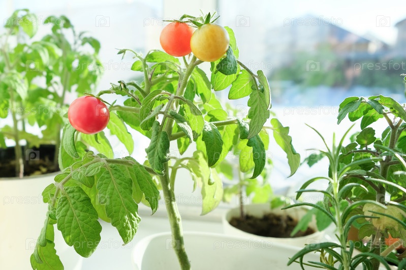 Помидоры черри и розмарин, выращенные в горшке в домашнем саду, в руке девушки
