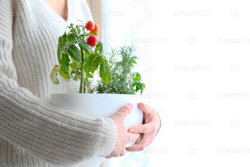 Помидоры черри и розмарин, выращенные в горшке в домашнем саду, в руке девушки