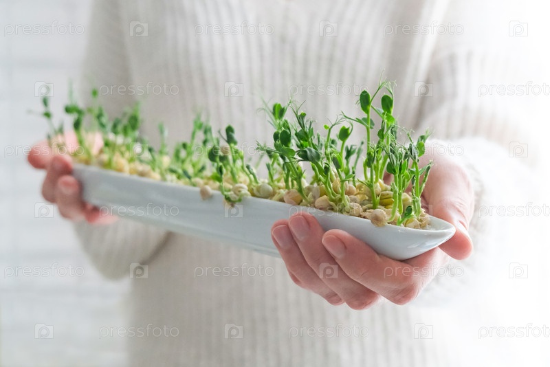 Микрозелень гороха в руках женщины. День Земли. Выращивание семян в домашних условиях. Место для текста. Концепция веганства и здорового питания. Выращивание саженцев