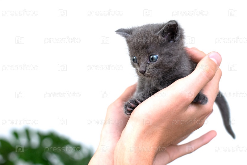 Серый кот в руках на белом фоне изолировать. Новорожденный серый котенок