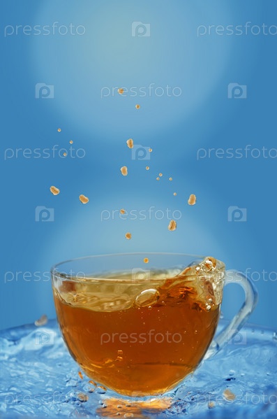 Брызги летят в разные стороны, чай со льдом в чашке