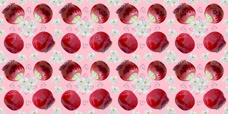 Бесшовный рисунок карамельных любовных яблок и цветков яблони на розовом фоне