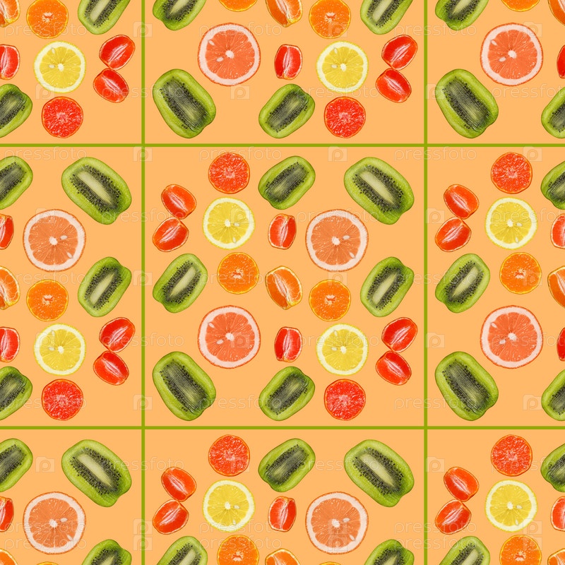 Бесшовный узор с ломтиками апельсина, лимона, киви, грейпфрута на оранжевом фоне