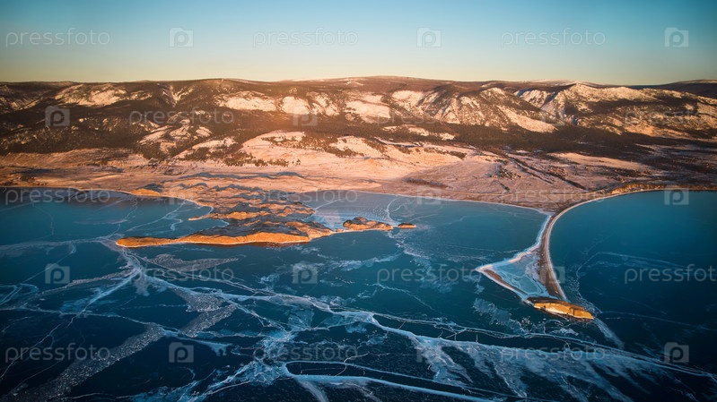Вид на замерзшее озеро Байкал в январе. Прозрачный лед с трещинами. Бухта Курма, мыс Уюга с воздуха