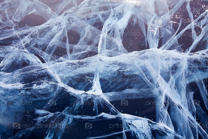 Красивый прозрачный голубой лед с трещинами. Озеро Байкал зимой. Естественный холодный фон льда