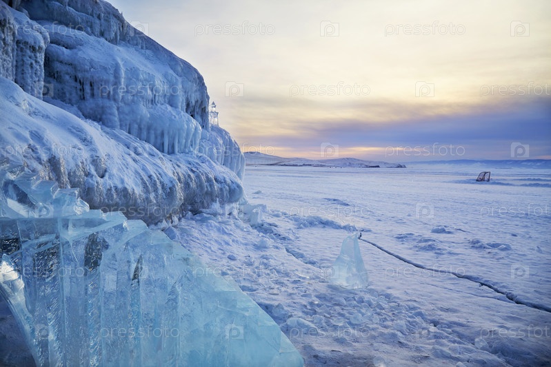Ледяные скалы и горы у берегов острова Ольхон зимой. Замерзшее озеро Байкал