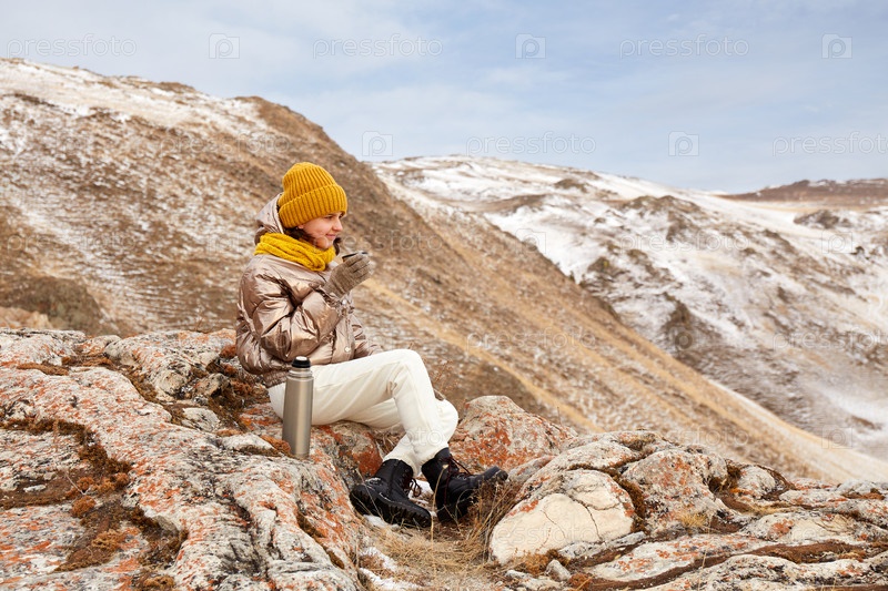 Молодая красивая путешественница сидит на камне и держит в руке чашку термоса