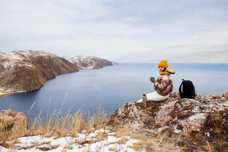 Молодая красивая путешественница сидит на скале с видом на море или озеро и держит в руке чашку термоса