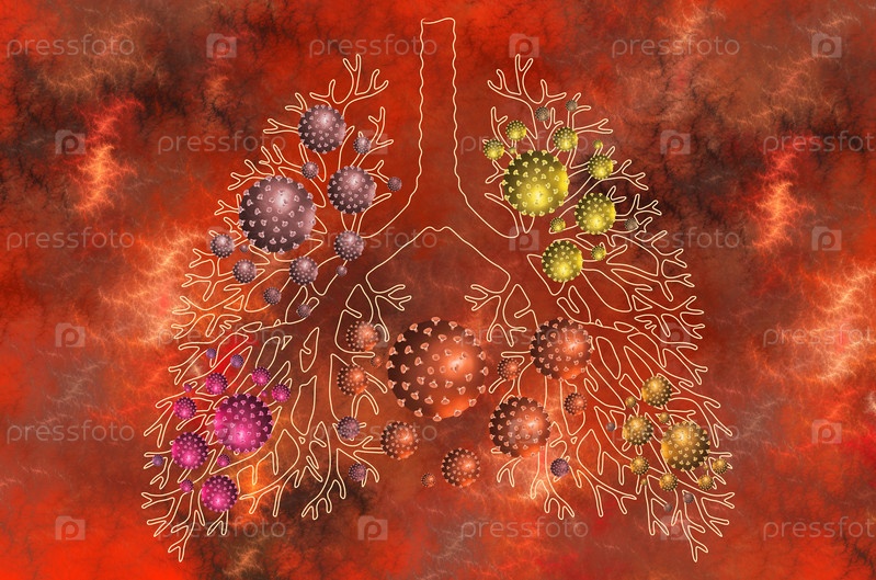 Повреждение органа легких человека различными мутациями вируса covid19. фрактальная 3D-модель коронавируса, абстракция