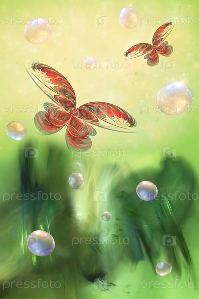 Фрактальная, красивая абстрактная цифровая природа с бабочками и пузырьками. Арт-дизайн, вертикальное обрамление