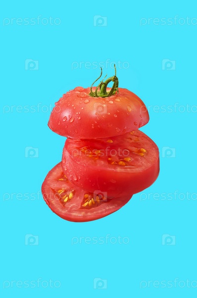 Нарезанный спелый помидор левитирует на синем фоне. Концепция приготовления