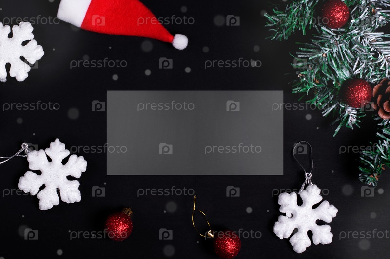 Темный рождественский фон с копией пространства. Праздничный венок, шляпа Санты, красные безделушки и снежинки. Новогодняя открытка