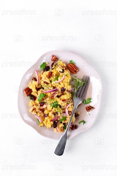 Салат с кускусом, сушеной клюквой, орехами пекан, красным луком, микрозеленью и апельсиновой заправкой на керамической тарелке. Здоровая веганская еда
