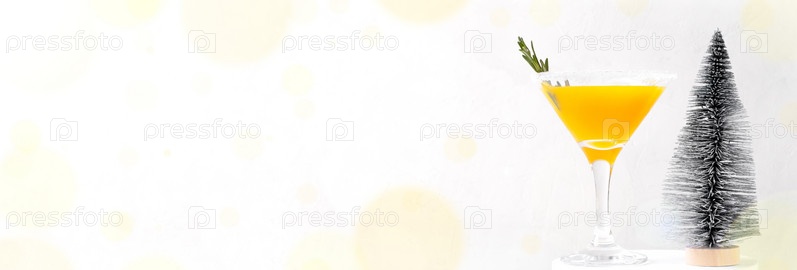 Веб-баннер с желтым коктейлем в бокале для мартини, украшенным сахарной каймой и розмарином. Рождественский напиток с манго на белом. Шаблон с копией пространства