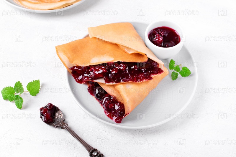 Блинчики с ягодным джемом на керамической тарелке на белом столе. Еда на завтрак. Празднование Масленицы