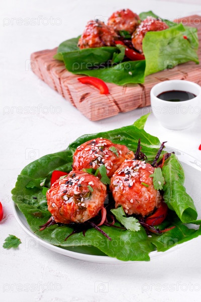 Фрикадельки из индейки, глазированные в соусе терияки с кунжутом, подаются с овощами на белом столе