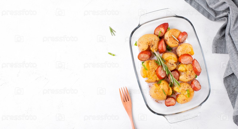 Картофельное пюре с колбасой и зеленью, запеченное в стеклянной посуде на белом столе. Горячая еда. Копировать пространство