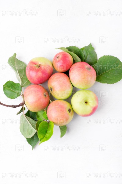 Яблоки с листьями на белом столе. Плоская укладка. Сбор фруктов
