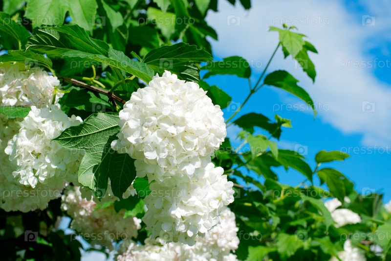 Белые цветы кустарника калины Snowball на фоне голубого неба в солнечный день