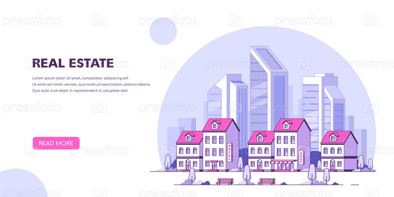 Городской пейзаж, городская улица с таунхаусами и небоскребами на заднем плане. Современный город. Шаблон баннера веб-сайта концепции. Векторная иллюстрация в плоском стиле