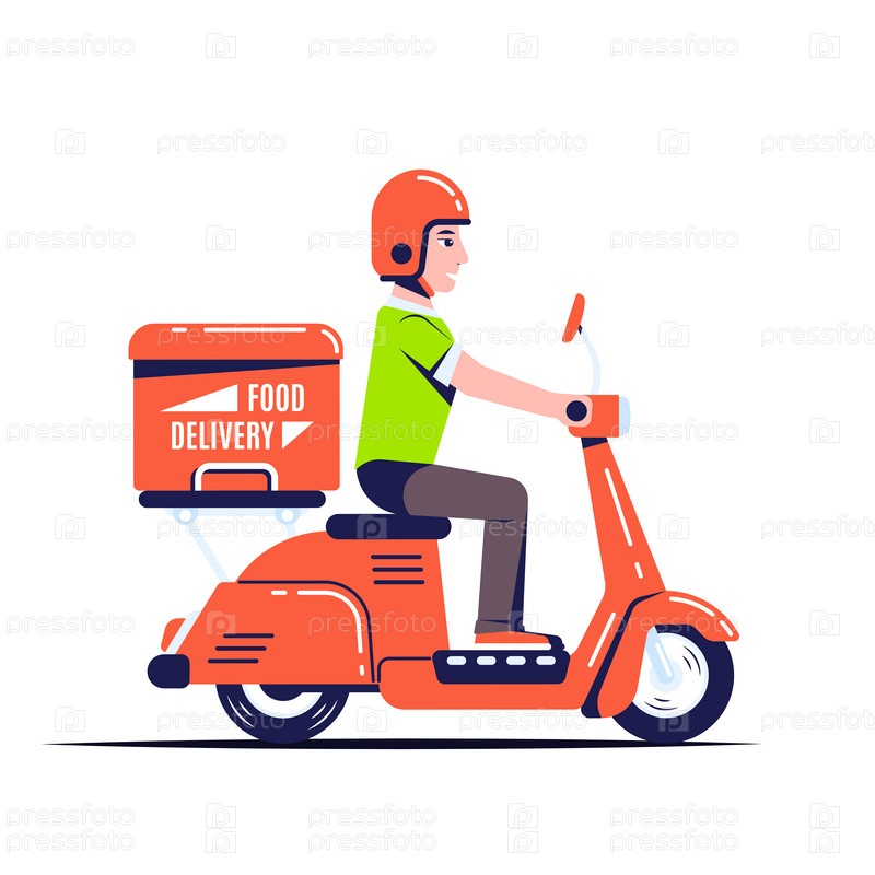 Мотоцикл доставщика на скутере с коробкой. Концепция службы доставки еды. дизайн персонажей изолирован на белом фоне. Иллюстрация в плоском стиле