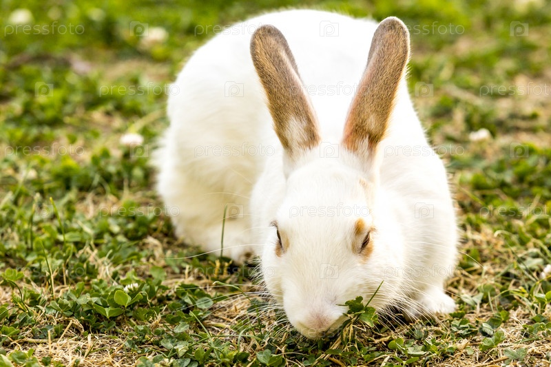 Белый кролик (Oryctolagus cuniculus) питается зеленой свежей травой