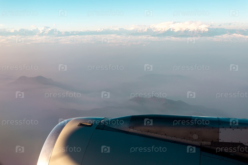 Вид на гору Гималаи из иллюминатора самолета. Самолет летит над горами. Концепция путешествия