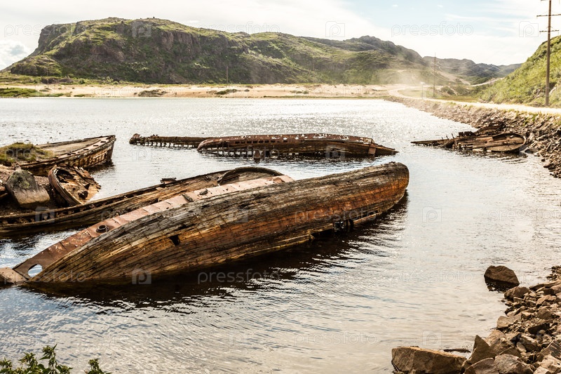 Затонувшие старые деревянные рыбацкие лодки в Териберке, Мурманская область, Россия