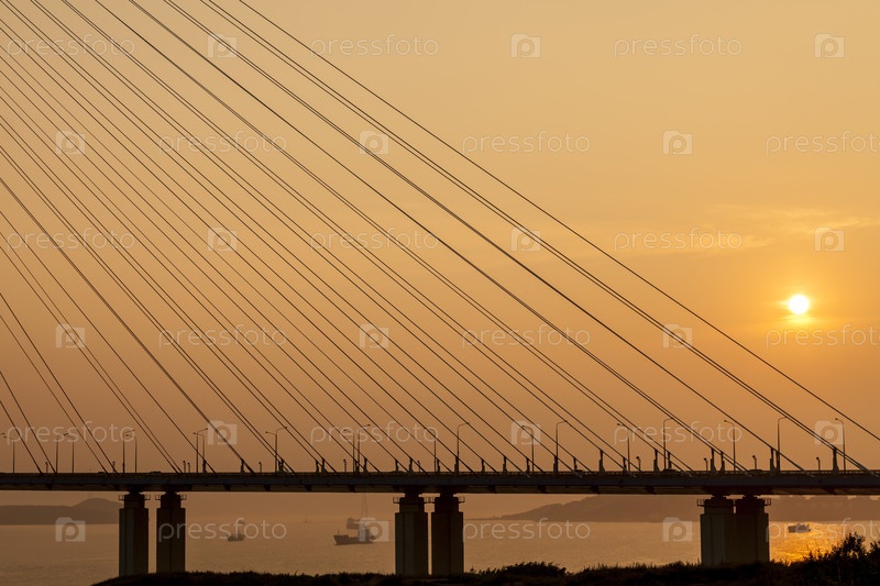 Вантовый мост "Русский мост" на остров Русский на закате. Владивосток, Приморский край, Россия