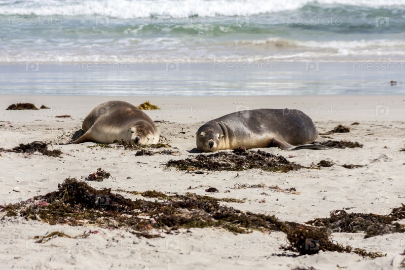 Спящие австралийские морские львы (Neophoca cinerea) на побережье острова Кенгуру, Южная Австралия, залив Сил
