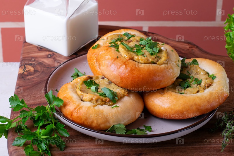 На тарелке подаются булочки-ватрушки с картофелем и жареным луком, посыпанные зеленью. блюдо русской кухни