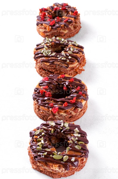 Торты в форме пончиков с карамелью, шоколадом, тыквенными семечками и ягодами годжи на белом столе. Вариант десерта