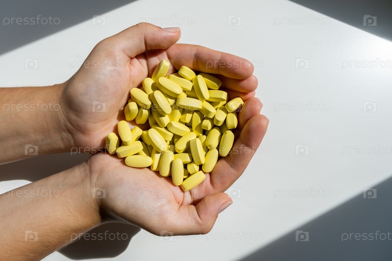Руки держат много витаминных капсул или таблеток с лекарствами. Здравоохранение или медицинская концепция
