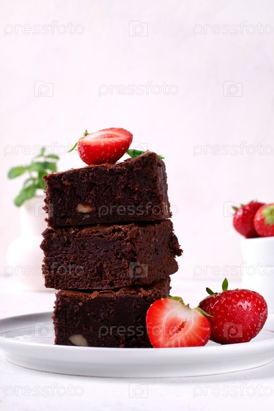 Стопка кусочков шоколадного пирожного с орехами и клубникой на белой тарелке. Домашний десерт