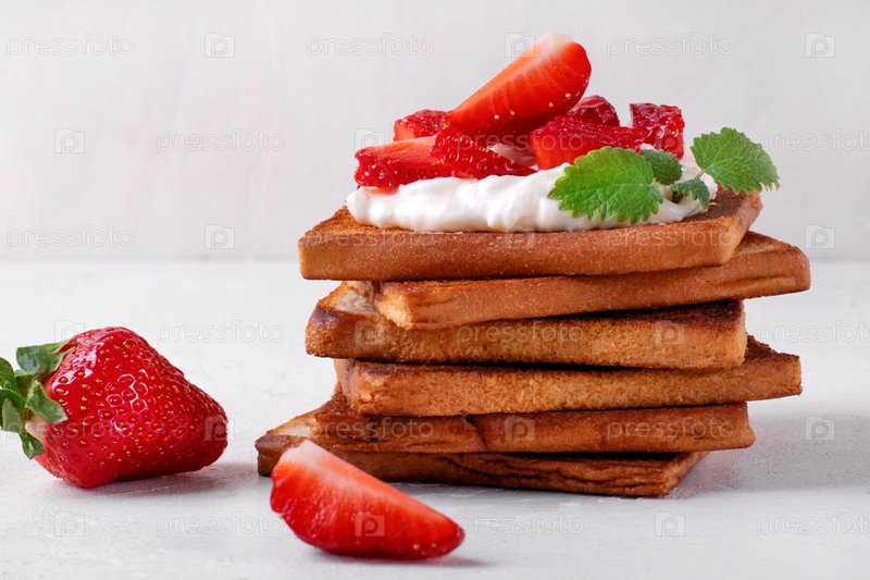Брускетта с клубникой и сыром страчателла на стопке поджаренных ломтиков хлеба на белом столе. Изысканная закуска