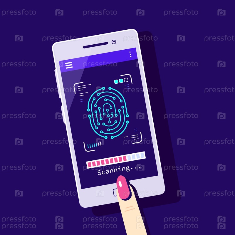 Сканирование отпечатков пальцев на мобильный телефон. Система безопасности идентификатора смартфона. Дизайн баннера в плоском стиле