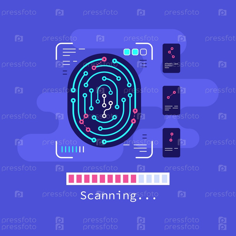 Сканирование отпечатков пальцев на мобильный телефон. Технология биометрической идентификации. Дизайн баннера в плоском стиле