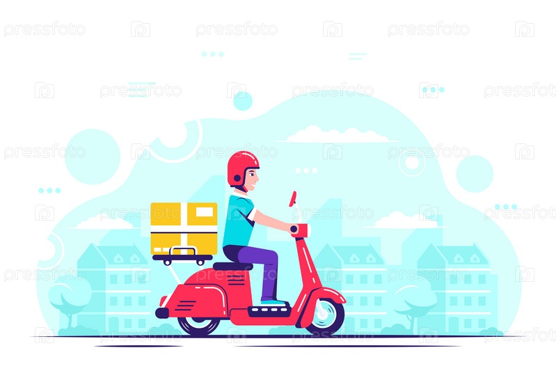 Мотоцикл доставщика на скутере с коробкой. Дизайн веб-баннера. Концепция службы доставки товаров. Иллюстрация в плоском стиле