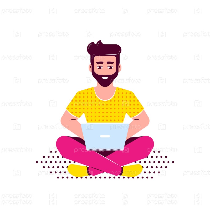 Молодой человек работает с ноутбуком. Иллюстрация в плоском стиле на веселом персонаже использует мобильное устройство