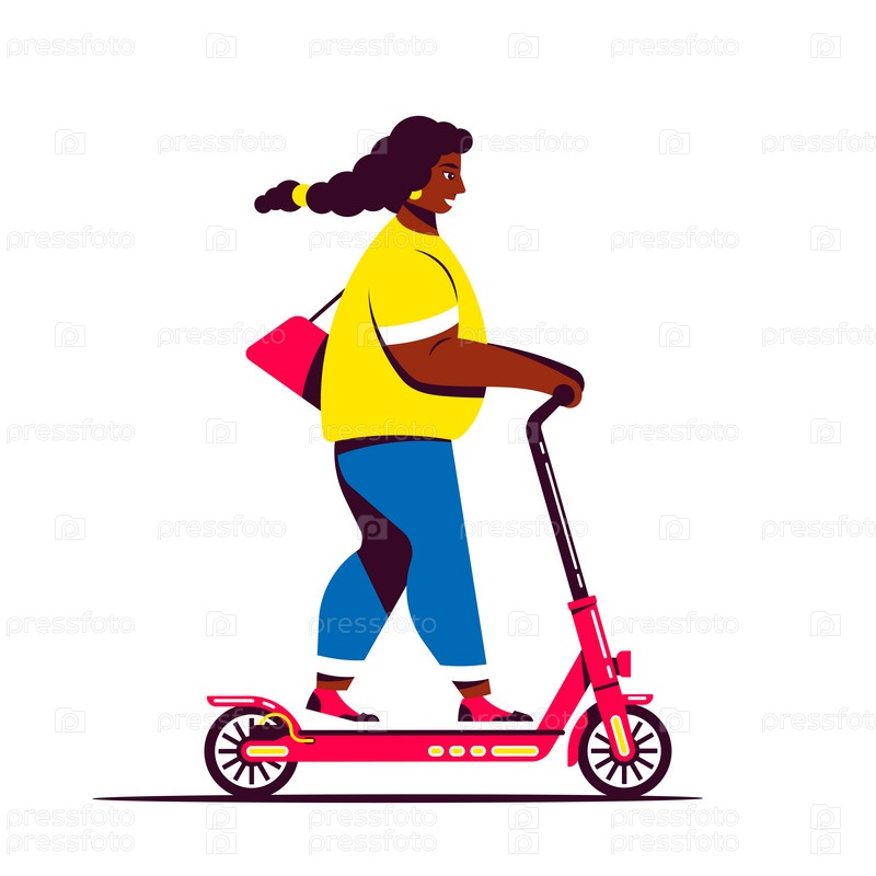 Изображение черной женщины за рулем электрического скутера на белом фоне. Аренда скутера, концепция совместного использования скутеров. Иллюстрация в плоском стиле