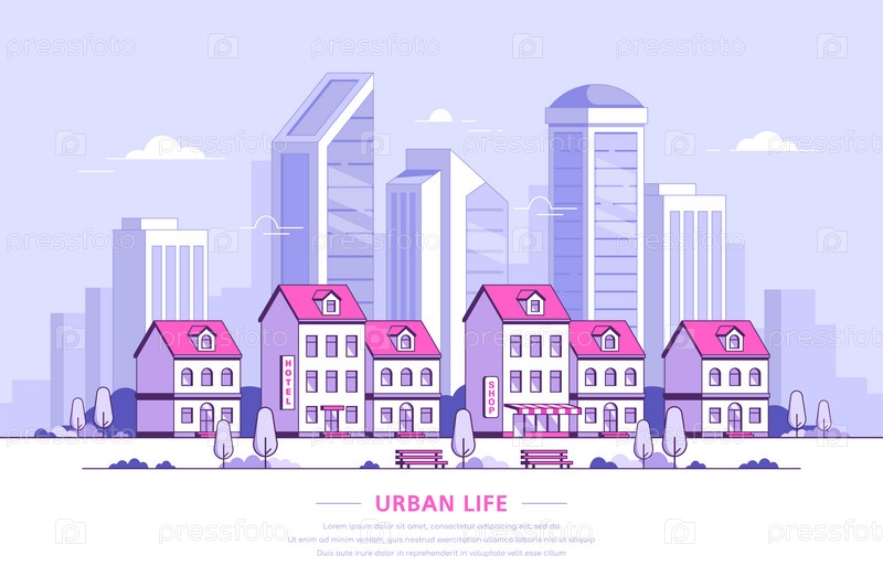 Иллюстрация городского пейзажа, дизайн баннера в плоском стиле