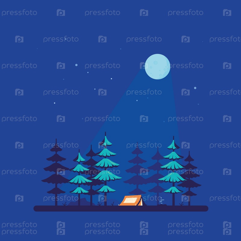 Иллюстрация ночного пейзажа в плоском стиле с палаткой и лесом. Фон для летнего лагеря, природного туризма, кемпинга или треккинга