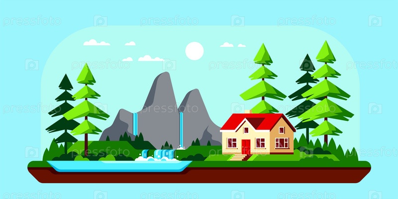 Семейный коттедж в лесу, иллюстрация плоского дизайна
