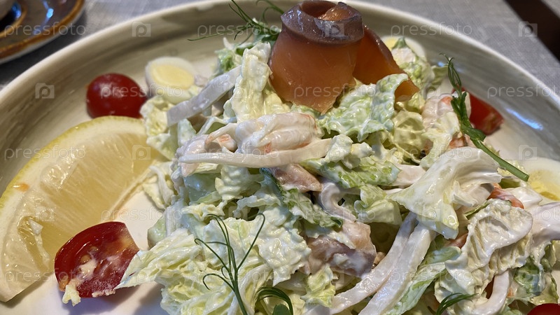 Большая тарелка с салатом из морепродуктов на столе