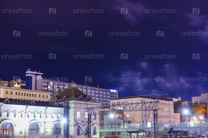 Владивосток, Россия - 26 июля 2020 г.: Ночной городской пейзаж с видом на железнодорожный вокзал