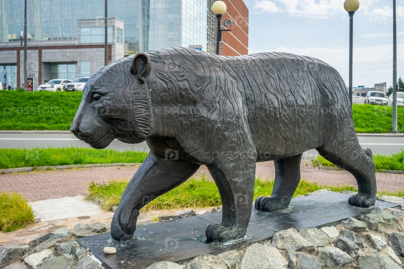 Владивосток, Приморский край - 3 сентября 2019 г.: Панорама городского пейзажа с видом на Золотой мост и скульптуру тигра