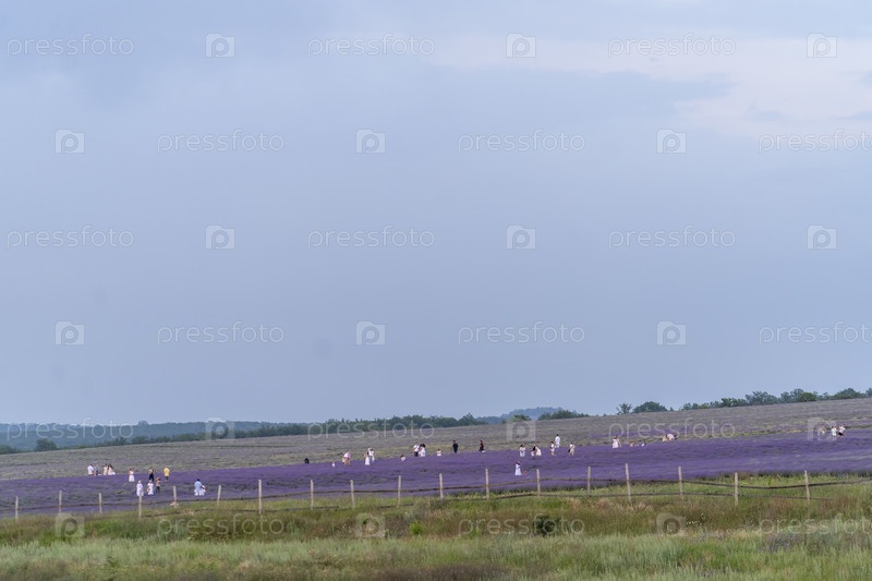 Тургеневка, Крым - 24 июня 2021 г.: Пейзаж с людьми на лавандовом поле