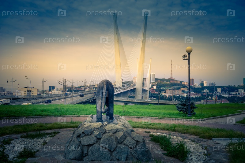 Владивосток, Приморский край - 3 сентября 2019 г.: Панорама городского пейзажа с видом на Золотой мост и скульптуру тигра